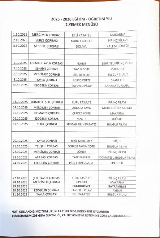 Okulumuz Ekim/2025 Yemek Menüsü (İlkokul)